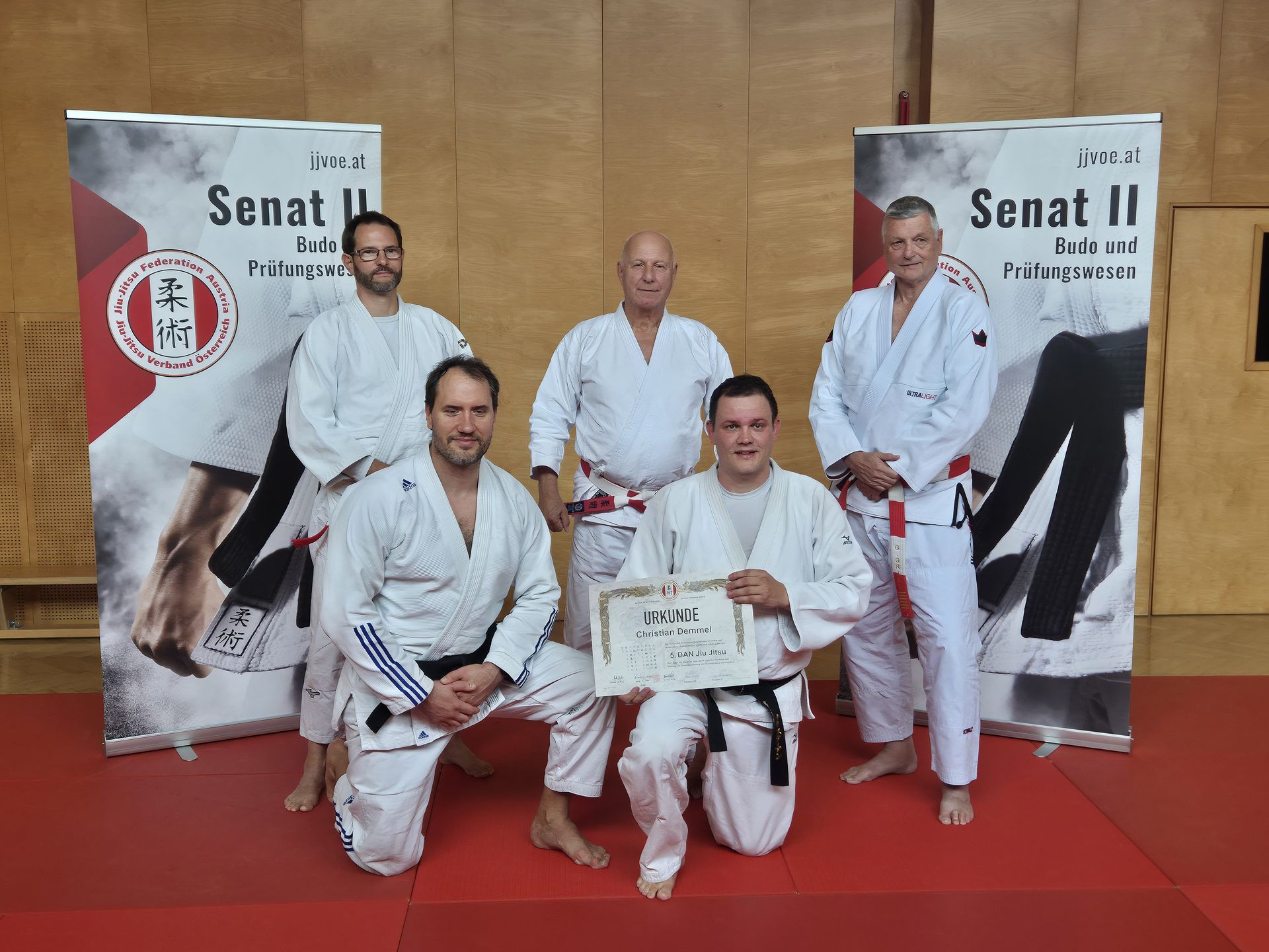 Am 04. Oktober 2025 durfte sich der JJVÖ wieder über einen Antritt zur Prüfung zum 5. Dan freuen. Christian Demmel (Jiu Jitsu Seishin Graz) stellte sich in Graz der hochkarätigen Prüfungskommission bestehend aus Robert Reinberger Kyoshi 8. Dan, Daniel Hofmann Shihan 6. Dan und Günter Grill Shihan 6. Dan.